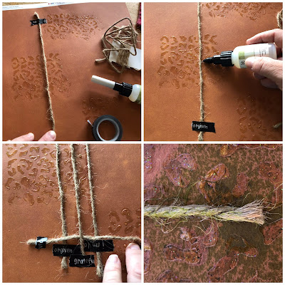 7 .Add 3 pieces of twine to the center of the page holding them down with washi tape